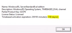 Name: Windows, ServerStandardEval edition Description: Windows Operating System, TIMEBASED_EVAL channel License Status: Licensed Timebased activation expiration: xx min (xx days)