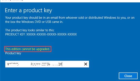 If you try to specify the KMS, Retail, or MAK product key on Windows Server Evaluation edition, the following warning appears: “This edition cannot be upgraded”.