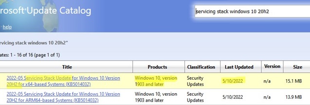 In this example, I found that the latest Servicing Stack Update for Windows 20h2 is released in May 2022. Download and install SSU before installing your update.