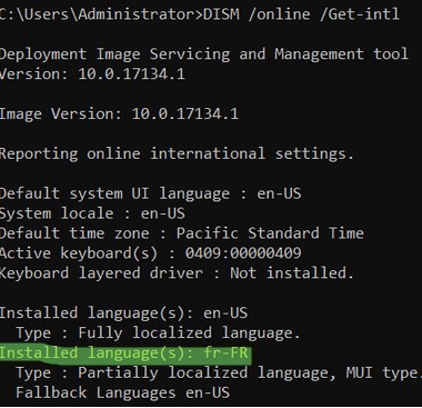 This example shows that the computer is running an English version of Windows:Installed language(s): en-US Type : Fully localized language