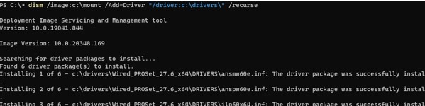 Now search for drivers (recursively) and add new drivers into the driver store of the Windows Server 2022 image: