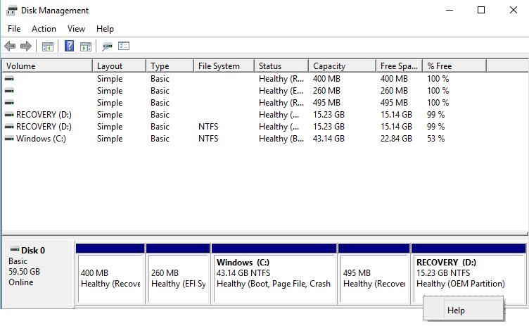 Open the Disk Management Console (diskmgmt.msc). In our example, the drive has a 15GB recovery partition with the volume label Recovery and the type Healty OEM Partition. If you right-click on the OEM Recovery partition in Disk Management, you will see that there is no menu items (and no option to remove the partition).