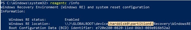 In our example, this is partition 4 on drive 0. (\\?\GLOBALROOT\device\harddisk0\partition4\Recovery\WindowsRE).