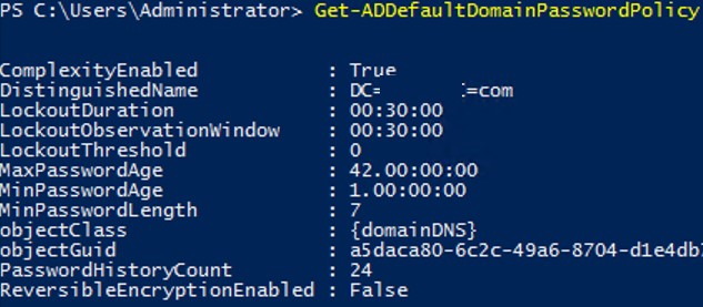 ReversibleEncryptionEnabled: FalseAlso, you can check the current AD password policy settings on any domain computer using the gpresult command.