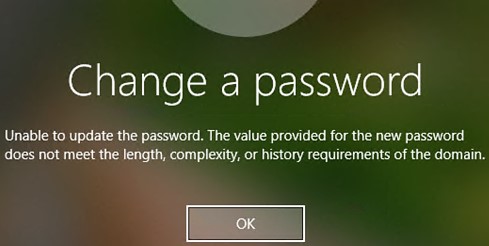 Unable to update the password. The value provided for the new password does not meet the length, complexity, or history requirements of the domain.