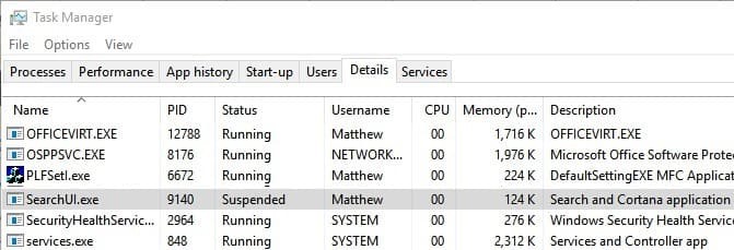 3. Find SearchUI.exe in the list of processes, right-click on it and select End Task;kill cortana search process SearchUI.exe