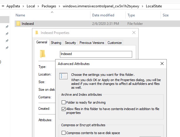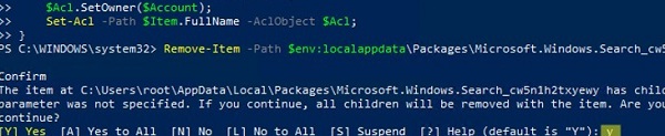 The exact directory to Remove is: “C:\Documents and Settings\username\AppData\Local\Packages\Microsoft.Windows.Search_******”