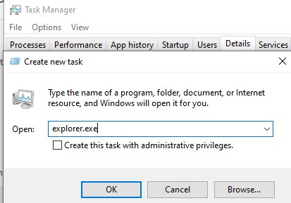 4. Start Explorer.exe using the Task Manager (File -> Create new task -> explorer.exe).restart explorer.exe