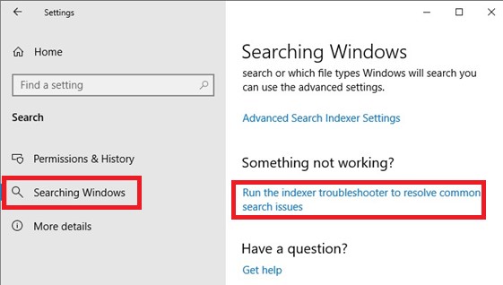 1. Go to Settings -> Search -> Searching Windows. Scroll down the list and click on “Run the indexer troubleshooter to resolve common search issues”;