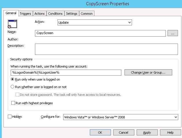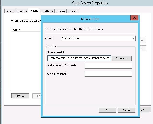 In the Action tab, specify that the following script has to be run: \\contoso.com\SYSVOL\contoso.com\scripts\copy_screens.bat