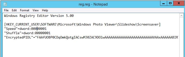 Now export the following registry branch HKEY_CURRENT_USER\Software \Microsoft\Windows Photo Viewer\Slideshow\Screensaver in a .reg file and import it on the domain controller (or another computer, on which you edit the GPO).
