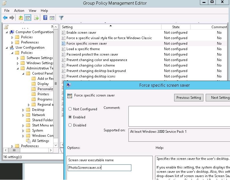 Then go to the following GPO section: User Configuration -> Policies -> Administrative Templates -> Control Panel -> Personalization. Enable Force specific screen saver, and specify PhotoScreensaver.scr as its value. (By default, Photoscreensaver.scr uses the folder C:\Users\Public\Pictures\Sample Pictures as the source of the screensaver images.)