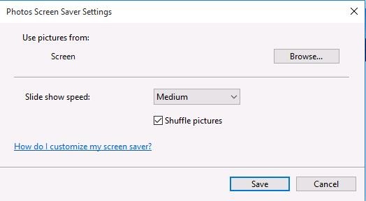 In Windows 10, go to the following settings section: Start -> Settings -> Personalization -> Lock Screen. Scroll down to find Screen Saver Settings. Select ‘Photos’ as a screensaver and click Settings.