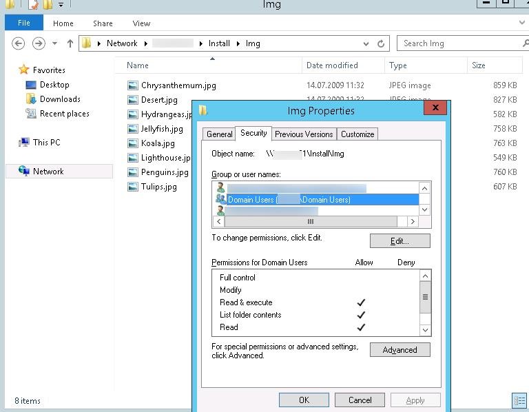 First of all, create a network share to store the source images for your slideshow on any server in your network. Grant all domain users (Domain Users group) the privileges to read files in this folder. For example, in our case the UNC path to the files is \\srv1\Install\Img. Copy the images here.