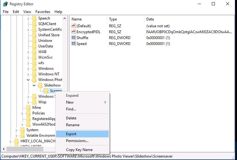 Go to HKEY_CURRENT_USER -> Software -> Microsoft -> Windows Photo Viewer -> Slideshow -> Screensaver. Check the following keys and click Finish:
