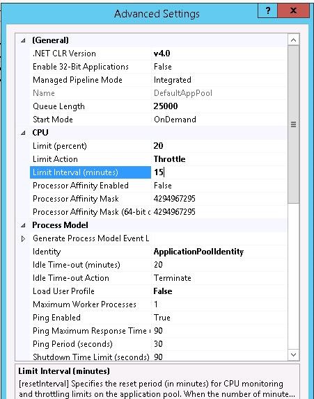 - Limit Interval (minutes) — 15 (increase the time to reset the counters and run CPU Throttling from 5 to 15 minutes)