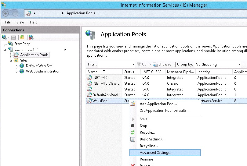 Then using IIS Manager, make the following changes to WsusPool settings (Application Pools -> WsusPool -> Advanced settings)