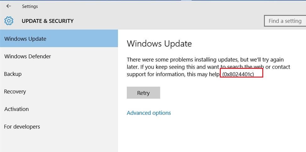 According to the list of Windows Update error codes, error 0x8024401C means the client response timeout: WU_E_PT_HTTP_STATUS_REQUEST_TIMEOUT — HTTP status 408 — the server timed out waiting for the request.