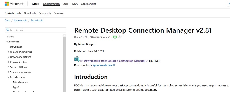 The last available version of RDCMan 2.7 was released in 2014 and development has stopped since then. In addition, a critical vulnerability was found in this version and Microsoft decided to completely remove the RDCMan download page in 2020. However, in June 2021, Mark Russinovich announced that the RDCMan tool is moving to the Sysinternals tools and will develop further. On June 24, 2021, a new version of Remote Desktop Connection Manager 2.81 was released with fixed vulnerabilities.