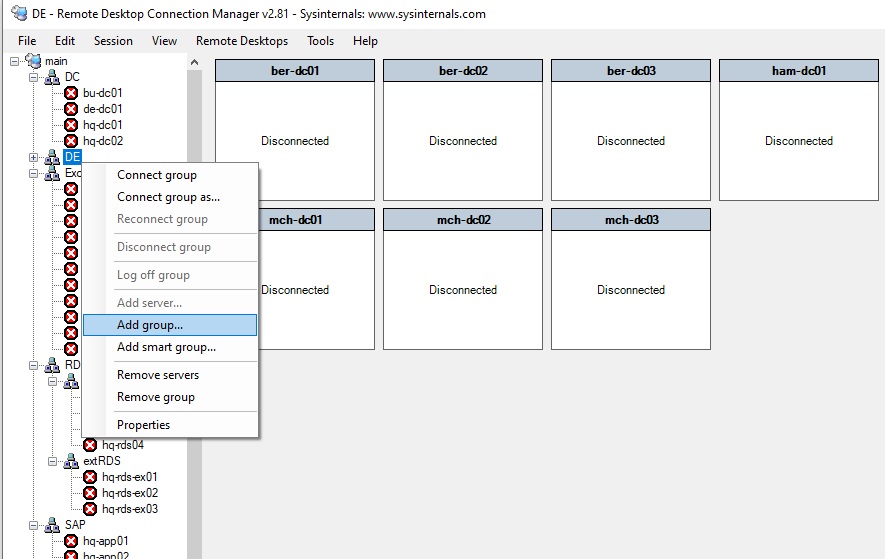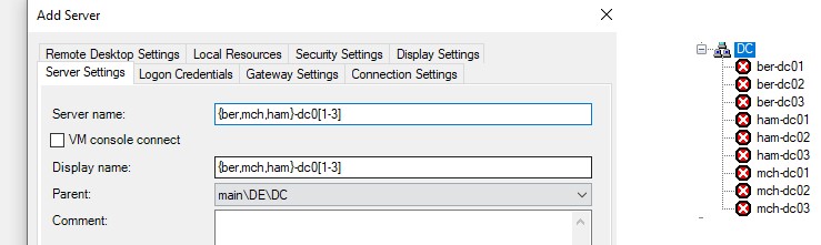For example, specify the following string as the server name: {ber,mch,ham}-dc0[1-3] and 9 servers will be added to the RDCman console.