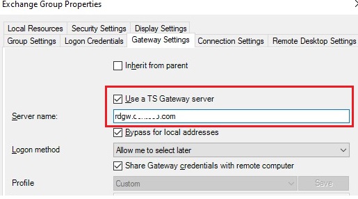 If you need to connect to a remote RDSH host through a published server with the RD Gateway role, you can set its parameters on the Gateway Settings tab.