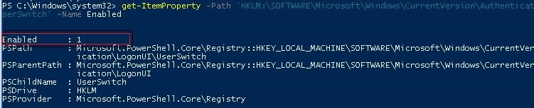 get-ItemProperty -Path 'HKLM:\SOFTWARE\Microsoft\Windows\CurrentVersion\Authentication\LogonUI\UserSwitch' -Name Enabled