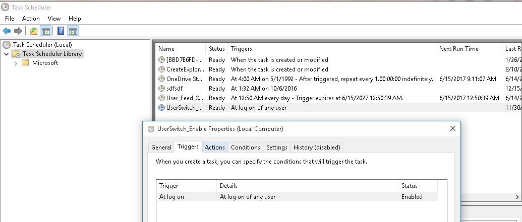 Register-ScheduledTask -TaskName "UserSwitch_Enable" -Trigger $Trigger -User $User -Action $Action -RunLevel Highest –Force