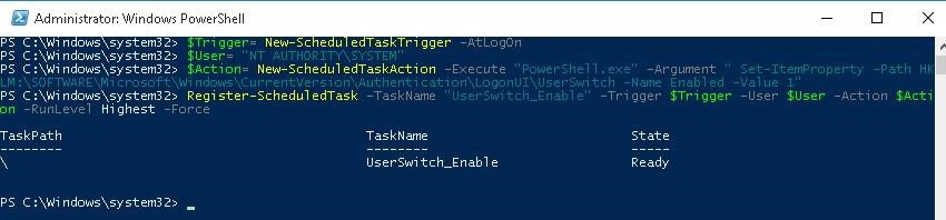 $Action= New-ScheduledTaskAction -Execute "PowerShell.exe" -Argument "Set-ItemProperty -Path HKLM:\SOFTWARE\Microsoft\Windows\CurrentVersion\Authentication\LogonUI\UserSwitch -Name Enabled -Value 1"