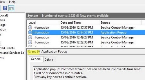 And before the user disconnect, the Event ID 26 is logged in the System Event Viewer.