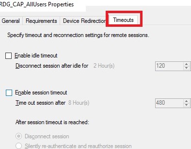 If you have a Remote Desktop Services farm deployed on Windows Server, you can configure user session timeout settings in the RDS collection settings on the Session tab.