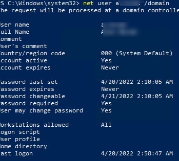 Password last set 4/22/2022 2:15:15 AM Password expires Never Password changeable 4/23/2022 2:15:15 AM Password required Yes User may change password Yes Last logon 4/22/2022 2:48:12 AM Logon hours allowed All