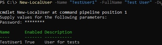 New-LocalUser -Name "TestUser1" -FullName "Test User" -Description "User for tests"