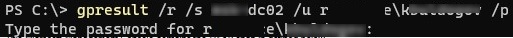 gpresult /R /S wks2b21c /scope user /U corp\jsmith /P myPaSSw0rd1!
