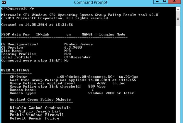 To get detailed information about the Group Policies applied to a specific user or computer, as well as other settings related to the GPO infrastructure (the resulting GPO policy settings, RsoP), open the command prompt and run this command: