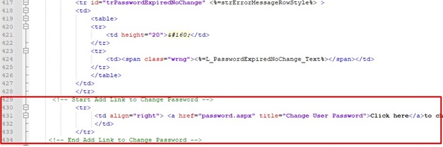 <tr id="trPasswordExpiredNoChange" <%=strErrorMessageRowStyle%> > … </tr>) and paste the following code: <!-- Begin: Add Change Password Link -->