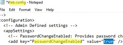 <!-- End: Add Change Password Link -->- Save the changes in the login.aspx file, restart the IIS website, and make sure that a link to the password change page appears on the sign-in page of the RD Web server.