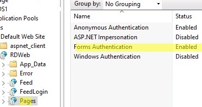 You can list and change the supported authentication types in the IIS Manager console. Select Sites -> Default Web Sites -> RDWeb -> Pages in the right pane, select Forms Authentication.