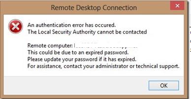 An authentication error has occurred. The Local Security Authority cannot be contacted Remote computer: lonSrvRDS1 This could be due to an expired password Please update your password if it has expired.