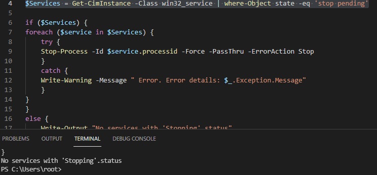 Write-Output "No services with 'Stopping'.status"