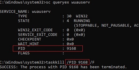 taskkill /F /FI "SERVICES eq wuauserv"