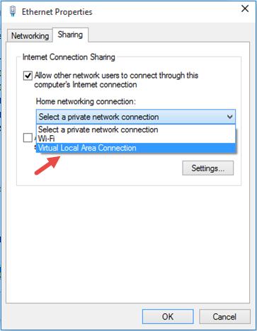 Allow Internet sharing for this connection. Go to the Sharing tab in the Ethernet Properties window. Check the box “Allow other network users to connect through this computer’s Internet connection” and select the name of the virtual adapter created earlier in the dropdown list.