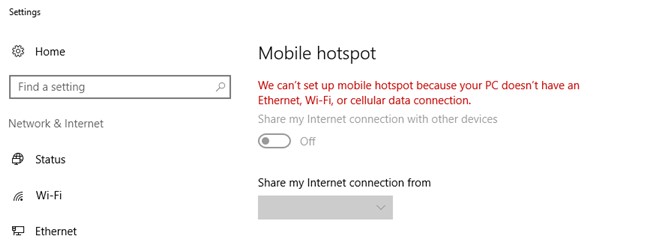 We can’t set up mobile hotspot because your PC doesn’t have an Ethernet, Wi-Fi or cellular data connection