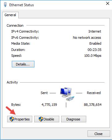 Click the Properties button on the network adapter status window.