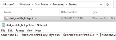 Win+R->shell:startup - Create a text file named start_mobile_hotspot.bat;
