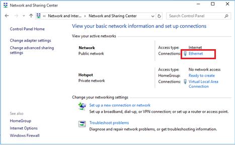 Now you need to allow devices connected to your virtual Wi-Fi access point to use a wired network connection to access the Internet. Go to Network and Sharing Center click, click on the name of the network adapter through which you can access the Internet. In our example, this is a connection named Ethernet.