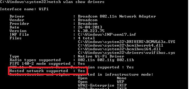 First of all, check that the driver of your Wi-Fi adapter supports the virtual access point operation mode (Ad-Hoc). To do it, run this command