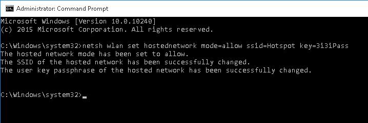 The hosted network mode has been set to allow. The SSID of the hosted network has been successfully changed. The user passphrase of the hosted network has been successfully changed.