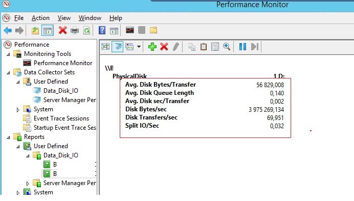 - To view the collected performance data go to the Perfmon -> Reports -> User Defined -> Data_Disk_IO —> check_the_last_set. By default, disk data is displayed as graphs;