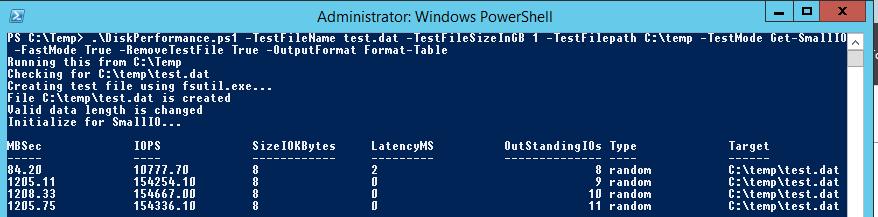.\DiskPerformance.ps1 -TestFileName test.dat –TestFileSizeInGB 1 -TestFilepath C:\temp -TestMode Get-LargeIO -FastMode True -RemoveTestFile True -OutputFormat Out-GridView