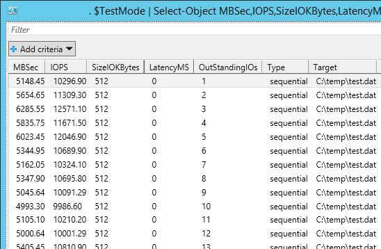 –TestFileName test.dat– the name of the file created by FSUTIL tool;–TestFileSizeInGB 1– the test file size. Possible values are 1.5, 10, 50, 100, 500, 1,000 GB. The file size has to be larger than the size of the storage system cache. Otherwise, IOPS will be measured for the cache data, instead of the disk;-TestFilepath C:\Temp– here you specify the disk to measure the performance for and the folder on the disk, in which a test file will be created. You can also specify an UNC path to the network shared folder (SMB);-TestMode Get-LargeIO– there are two options of input-output measurement. Get-SmallIO allows to measure IOPS, and Get-LargeIO measures data transfer rate. The difference between SmallIO and LargeIO arguments is in the block size of 8 KB and 512 KB while measuring the rate, and the type of access, Random or Sequential, correspondingly;-FastMode True– in the Fastmode, each test runs 10 seconds, otherwise it takes 60 seconds;-RemoveTestFile True– remove the test file after the test is over;-OutputFormat Out-GridView– the test results can be displayed either in PowerShell console (Format-Table) or in a separate graphic chart window (Out-Gridview).